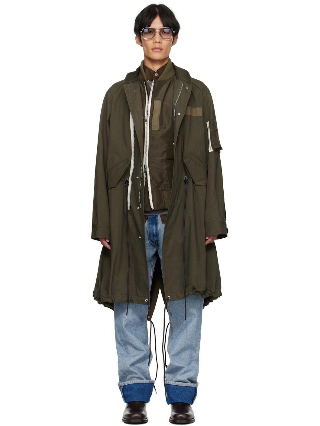 Padded cotton- and nylon-blend ripstop coat. · Paneled construction · Stand collar with rib-knit underlay · Two-way zip closure and press-stud placket · Webbing trim at chest · Flap pockets at waist · Drawstring at waist and hem · Rib-knit trim at hem · Utility pocket and pen slots at sleeve · Button tab at cuffs · Central vent at fishtail hem · Partial satin lining Supplier color: Khaki Body: 53% cotton, 47% nylon. Body 2: 100% nylon. Trim: 53% acrylic, 36% wool, 10% polyester, 1% polyurethane. Fill: 100% polyester. Lining: 100% polyester. Made in Japan 252445M176000