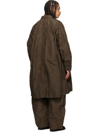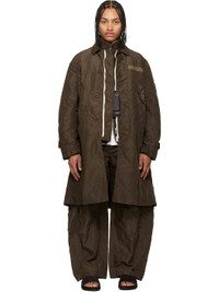 Insulated nylon twill coat. · Spread collar · Two-way zip closure · Button placket · Flap pockets and seam pockets at waist · Cord-lock drawstring at hem · Utility pocket at sleeve · Button tab at cuffs · Inset rib-knit cuffs · Central vent at back hem · Twill lining · Logo-engraved silver-tone hardware Supplier color: Khaki Body: 100% nylon. Trim: 55% polyester, 44% cotton, 1% polyurethane. Lining: 100% polyester. Fill: 100% polyester. Made in Japan 261445M176001