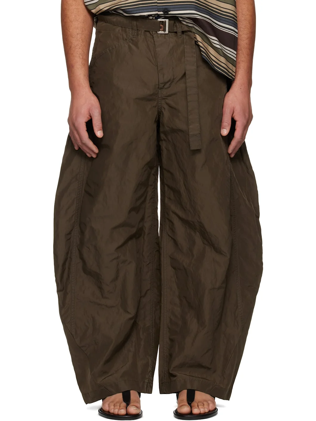 Crinkled twill trousers. · Wide leg · High-rise · Belt loops · Detachable cinch buckle belt · Four-pocket styling · Zip fly · Paneled construction at outseams · Logo-engraved hardware Supplier color: Khaki 100% nylon. Made in Japan 261445M191035