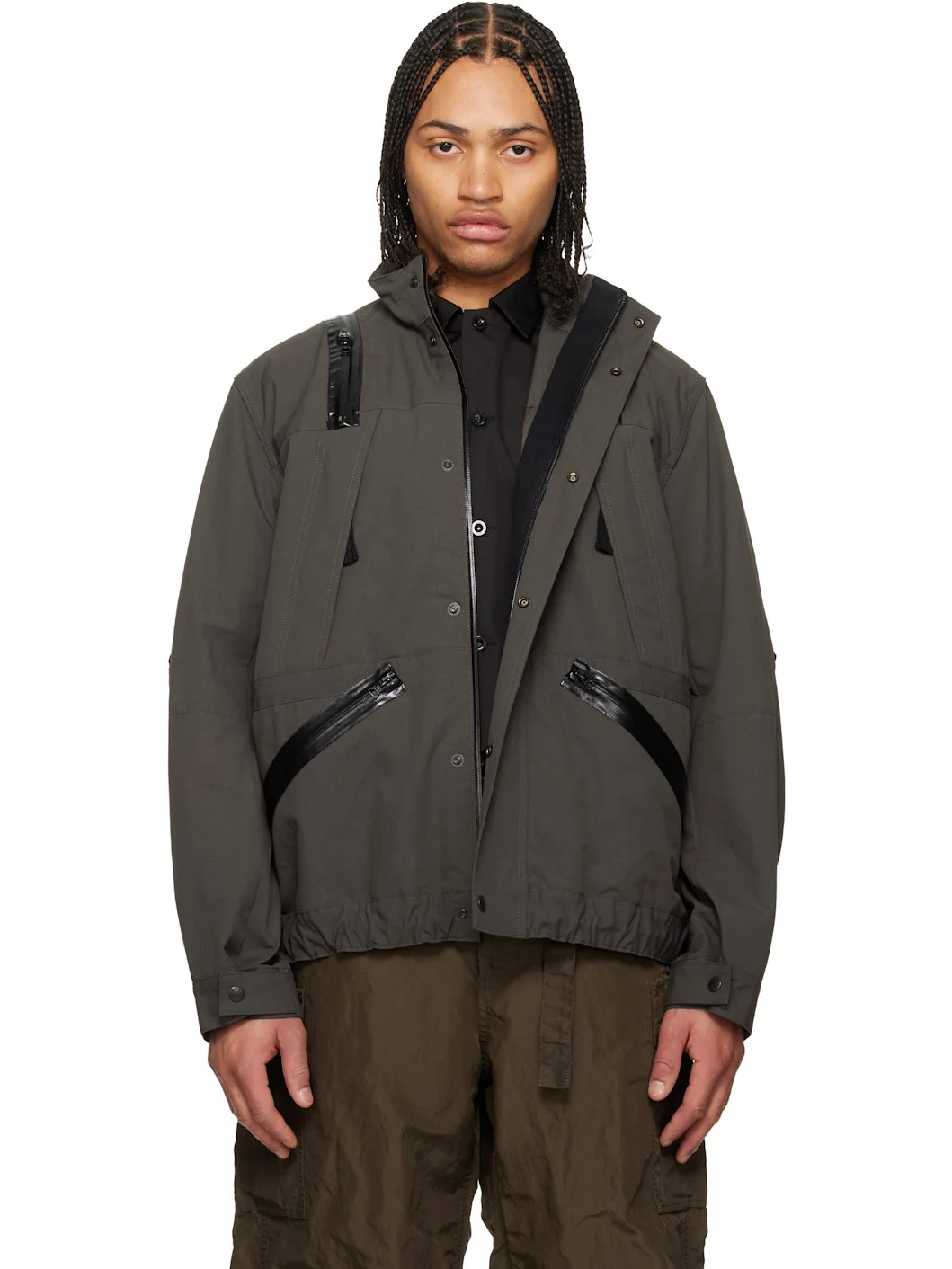 Taffeta jacket. · Drawstring at funnel neck, waist, and hem · Zip closure with press-stud placket · Concealed zip pockets at chest · Zip pockets at waist · Zip vent at shoulders and sleeves · Adjustable press-stud cuffs · Twill lining · Logo-engraved hardware Supplier color: Khaki 100% polyester. Made in Japan 261445M180019