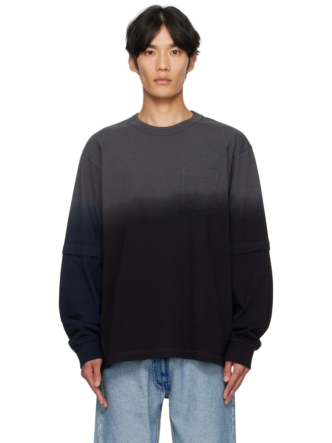 Garment-dyed cotton jersey T-shirt. · Gradient pattern throughout · Rib-knit crewneck and cuffs · Patch pocket at chest · Dropped shoulders · Layered sleeves · Logo printed at back collar Supplier color: Black 100% cotton. Made in Japan 252445M213033