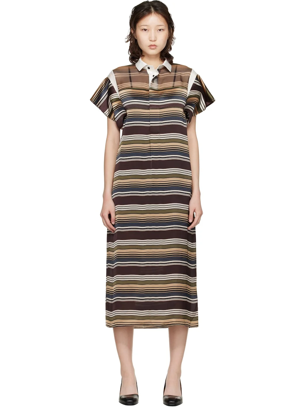 Sateen midi dress. · Stripes throughout · Spread collar · Three-button placket · Semi-sheer voile panel at shoulders · Vent at side seams · Cutout at sleeves · Includes cupro satin slip Supplier color: Brown/Beige Body: 100% polyester. Lining: 100% cupro. Made in Japan 261445F054000