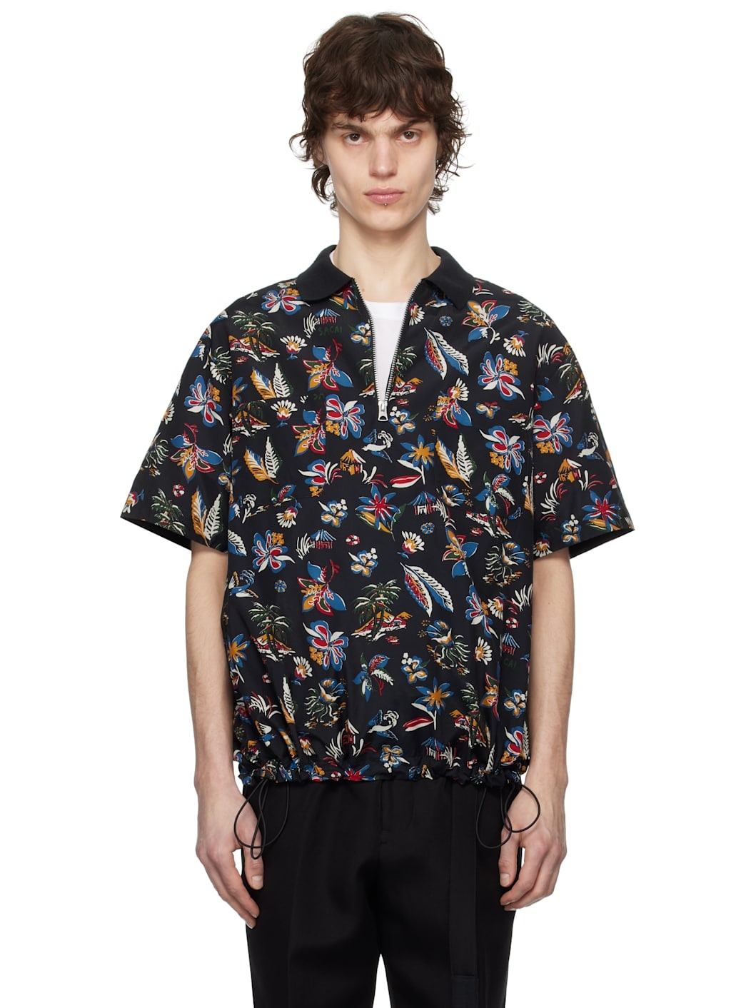 Rayon- and cotton-blend poplin polo. Graphic pattern printed throughout. · Paneled construction · Rib-knit spread collar · Half-zip closure · Patch pockets · Concealed bungee-style drawstring at hem · Dropped shoulders · Twin pleats at back yoke · Logo-engraved silver-tone hardware Supplier color: Black Body: 55% rayon, 45% cotton. Trim 1: 55% rayon, 44% cotton, 1% polyurethane. Trim 2: 100% cupro. Made in Japan 251445M212004