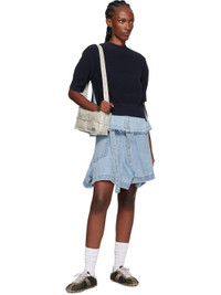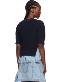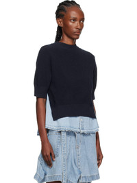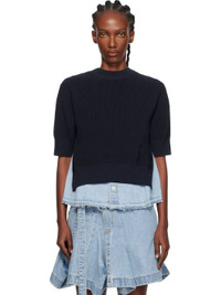 Rib-knit cotton-blend and non-stretch denim sweater. · Layered construction · Crewneck · Button fastening at front · Raw edge at shirttail hem · Pleats at back hem · Partial mesh lining · Contrast stitching in tan Supplier color: NavyxL/Blue Body 1: 57% cotton, 43% polyester. Body 2: 100% cotton. Lining: 100% polyester. Made in Japan 252445F096003