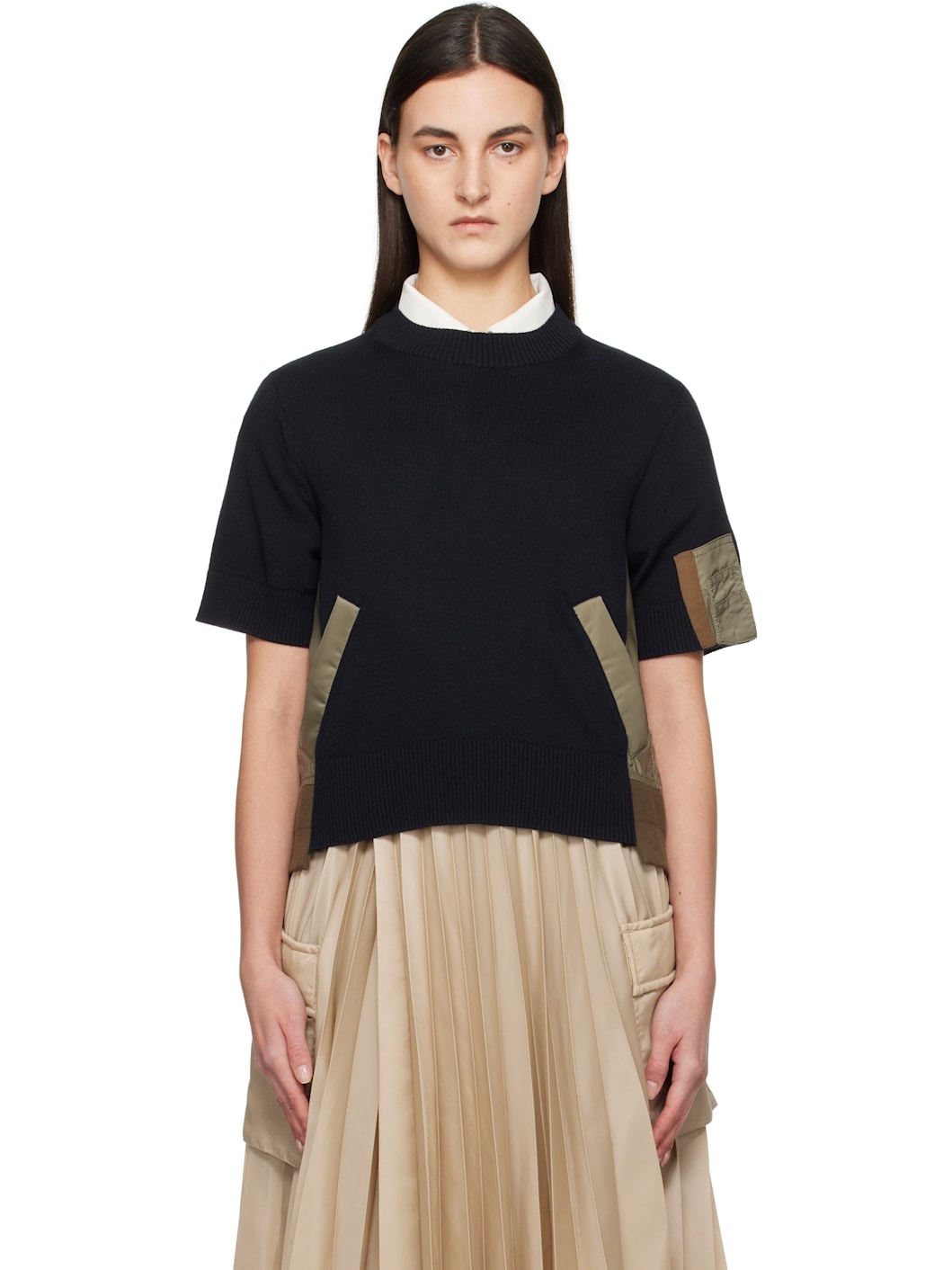 Knit cotton- and polyester-blend, nylon twill, and sheer polyester chiffon sweater. Grosgrain trim throughout. · Paneled and asymmetrical construction · Rib-knit crewneck, front hem, and cuffs · Welt pockets · Pen slots at sleeve · Pleats at back yoke Supplier color: Navy/Taupe Body 1: 57% cotton, 43% polyester. Body 2: 100% polyester. Body 3: 100% nylon. Trim: 55% polyester, 45% cotton. Fill: 100% polyester. Made in Japan 251445F096002
