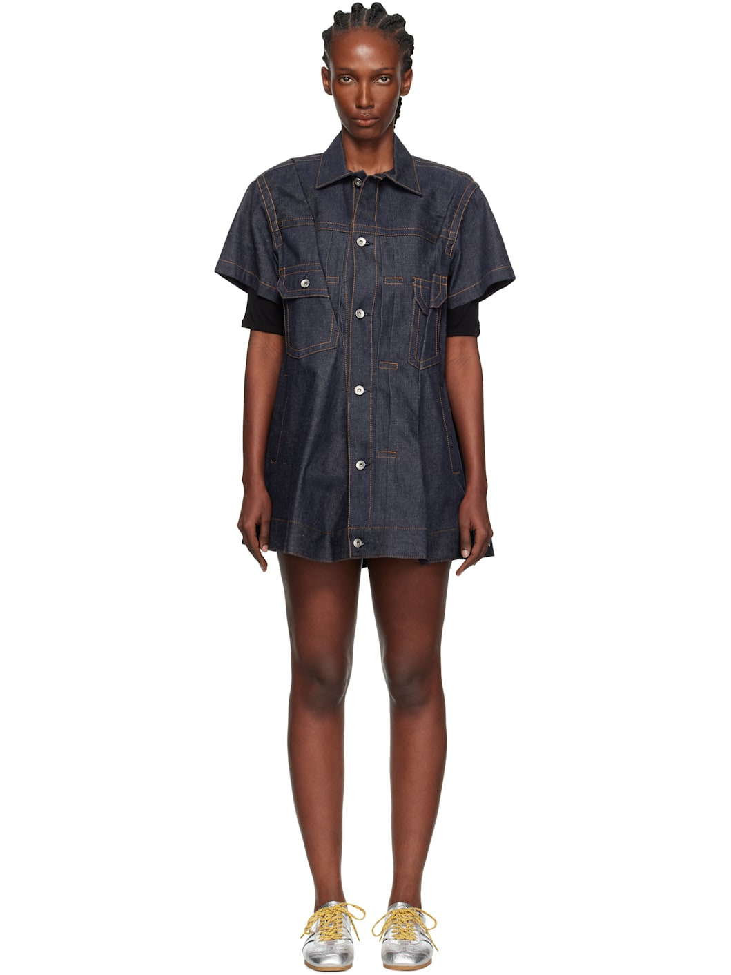 Non-stretch denim minidress. · Paneled construction · Spread collar · Button closure · Pintucks at front · Flap and welt pockets · Flared hem · Asymmetrical pleats at back · Adjustable buttoned tabs at back hem · Logo-engraved silver-tone hardware · Contrast stitching in tan Supplier color: Indigo 100% cotton. Made in Japan 252445F052007