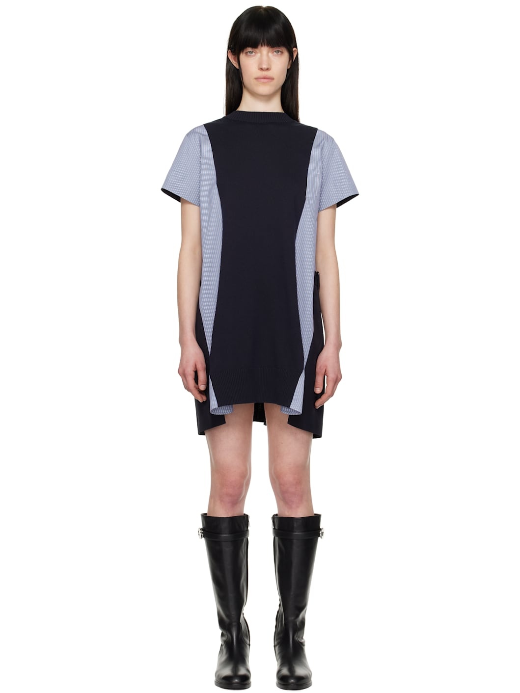 Knit cotton-blend and cotton poplin minidress. Stripes throughout. · Paneled construction · Rib-knit crewneck · Patch pocket at chest and side seams · Welt pockets at back · Partial cupro satin lining Supplier color: Navy/Blue stripe Body 1: 57% cotton, 43% polyester. Body 2: 100% cotton. Trim: 70% polyester, 30% wool. Lining: 100% cupro. Made in Japan 251445F052021