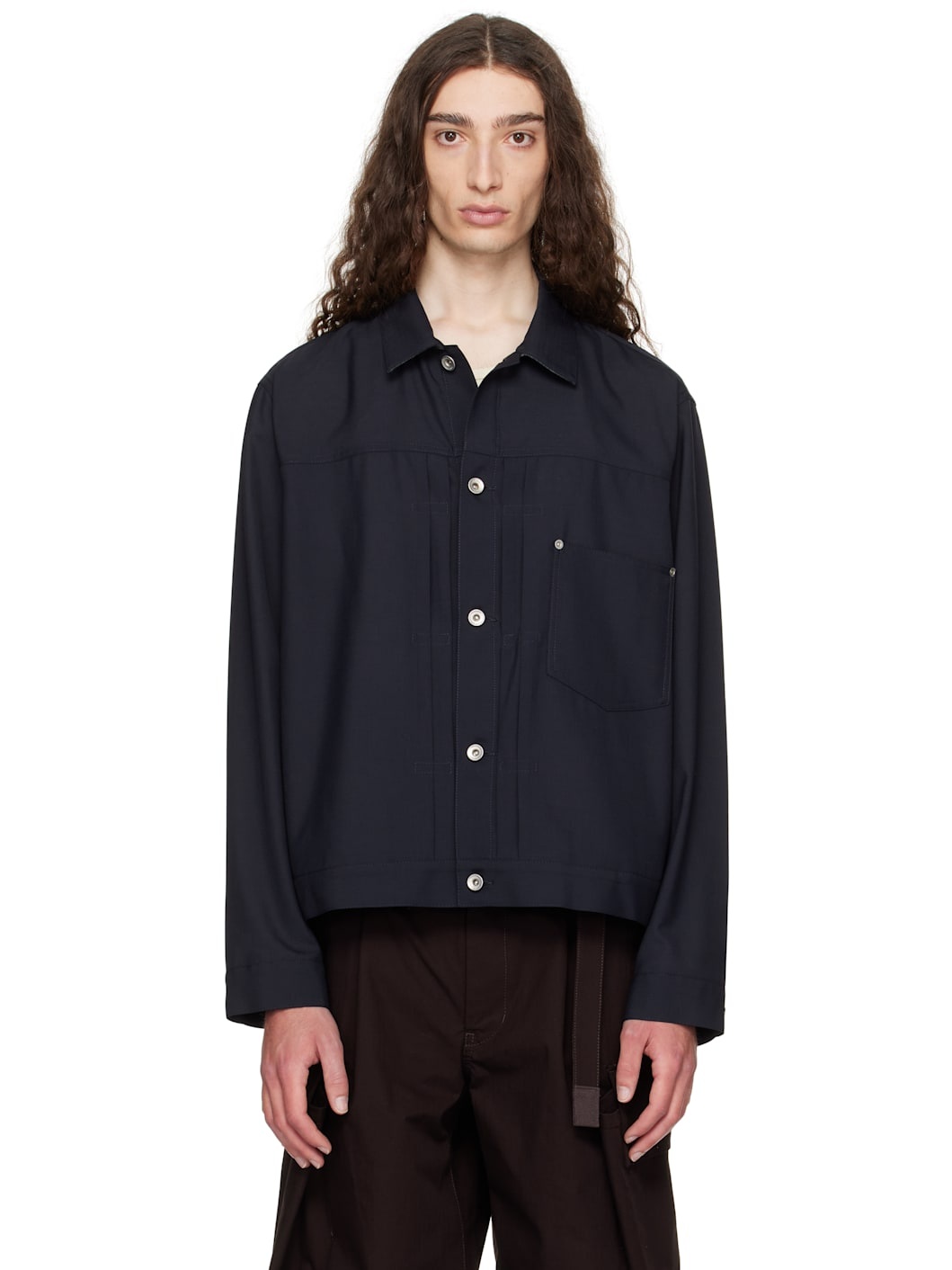 Plain-woven wool-blend jacket. · Spread collar · Button closure · Tucks at front · Patch pocket at chest · Seam pockets · Buttoned barrel cuffs · Pleats at back yoke · Cinch strap at back · Unlined Supplier color: Navy Body: 70% polyester, 30% wool. Trim: 100% cupro. Made in Japan 252445M180010