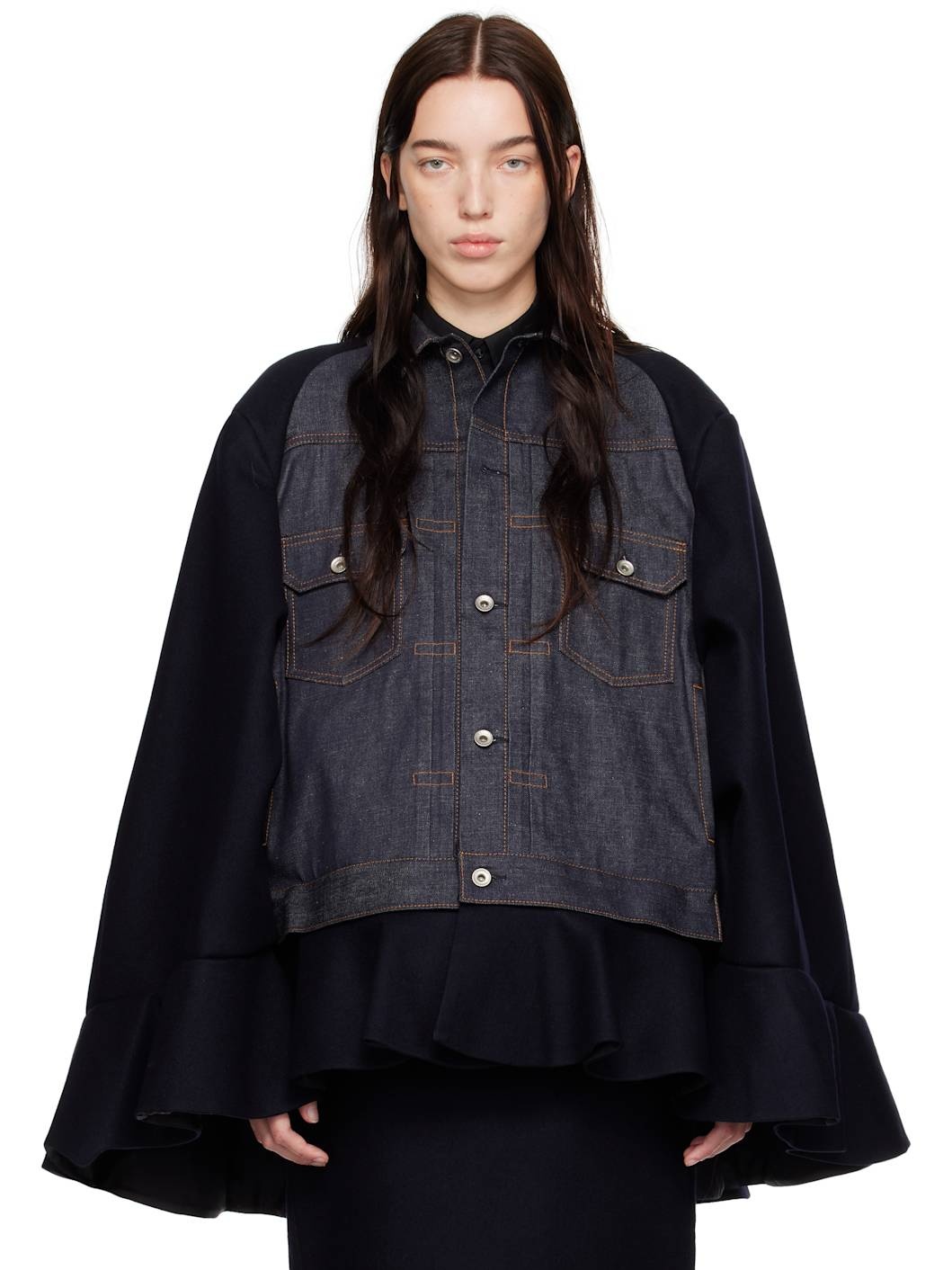 Ruffled wool-felt and denim cape
