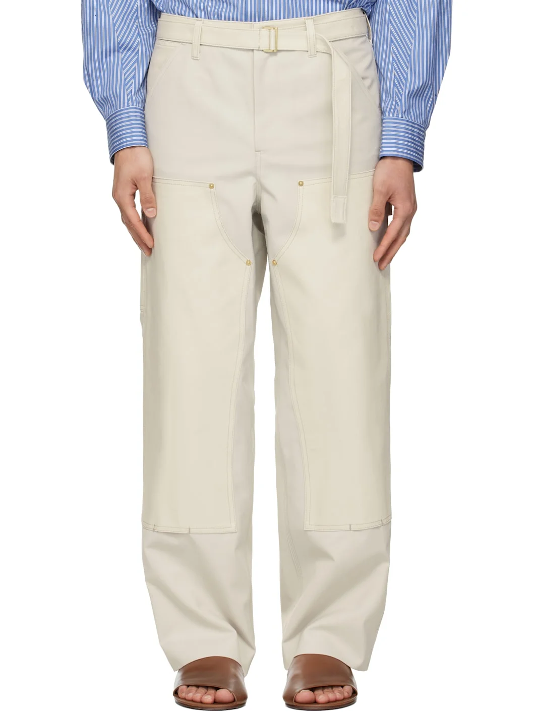 Plain-woven wool-blend trousers. · Cotton canvas trim throughout · Belt loops and detachable cinch belt at waistband · Four-pocket styling · Zip fly · Patch pockets at outseam · Hammer loop and patch pocket at outseam · Logo patch at back pocket · Full satin lining Part of the sacai x Carhartt Work In Progress collaboration. Supplier color: Ivory Body: 70% polyester, 30% wool. Trim: 100% cotton. Lining: 100% cupro. Made in Japan 261445M191029