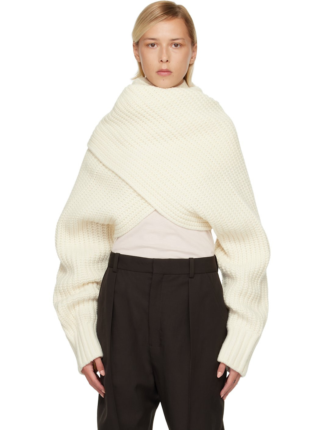 Rib-knit bolero-style turtleneck. · Converts to wrap sweater · Integrated hood · Extended sleeves Supplier color: Off white 80% wool, 20% nylon. Made in Japan 252445F099001