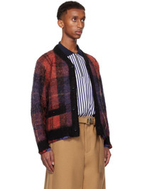 Padded brushed knit wool-blend boucle cardigan. Jacquard check pattern throughout. · Rib knit Y-neck, hem, and cuffs · Patch pockets · Press-stud vent at side seams · Raglan sleeves · Plaid pattern printed at full poplin lining Available exclusively at SSENSE. Supplier color: Red Body: 55% wool, 25% acrylic, 20% nylon. Fill: 100% polyester. Lining: 55% rayon, 45% cotton. Made in Japan 242445M200000