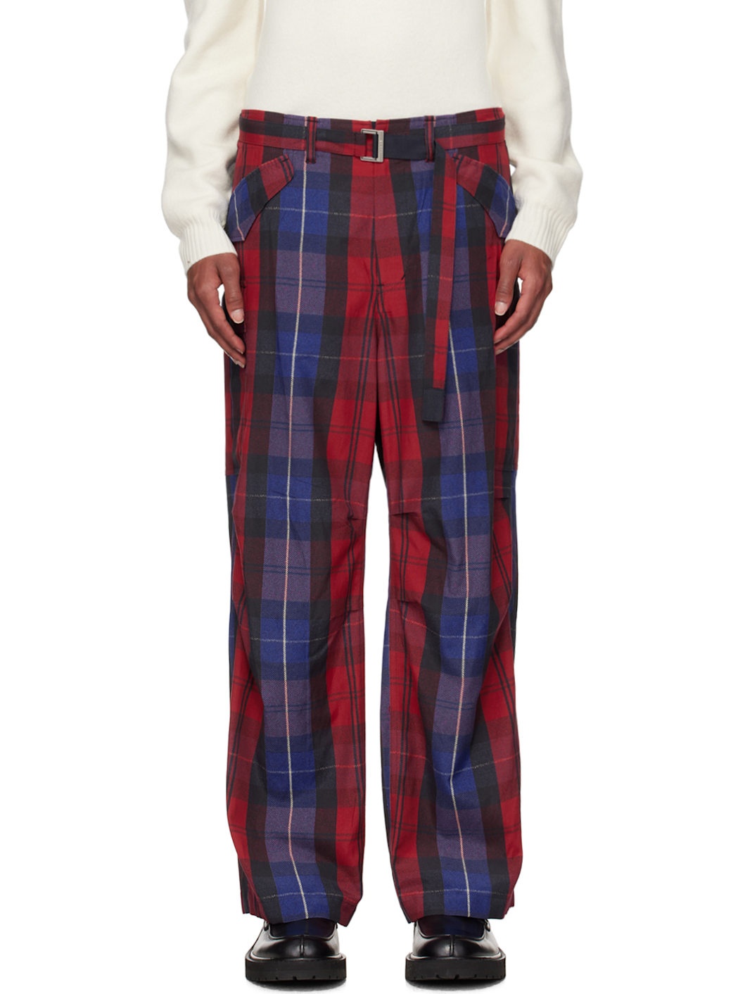 Rayon- and cotton-blend broadcloth cargo pants. Printed plaid pattern throughout. · Belt loops · Detachable cinch belt at waistband · Cinch straps at waistband · Zip-fly · Four-pocket styling · Tucks at knees · Drawstring at cuffs · Cargo pocket at outseams Available exclusively at SSENSE. Supplier color: Red 55% rayon, 45% cotton. Made in Japan 242445M188009