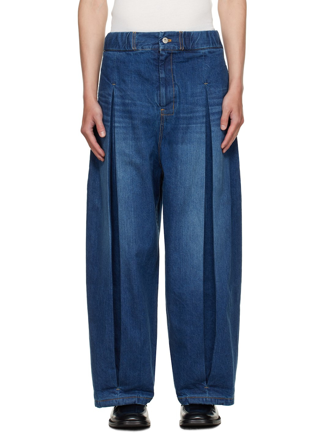 Non-stretch denim jeans. · Fading and whiskering throughout · Elasticized waistband · Four-pocket styling · Zip fly · Inverted box pleat at front legs · Contrast stitching in tan Supplier color: Indigo wash 100% cotton. Made in Japan 252654M186002