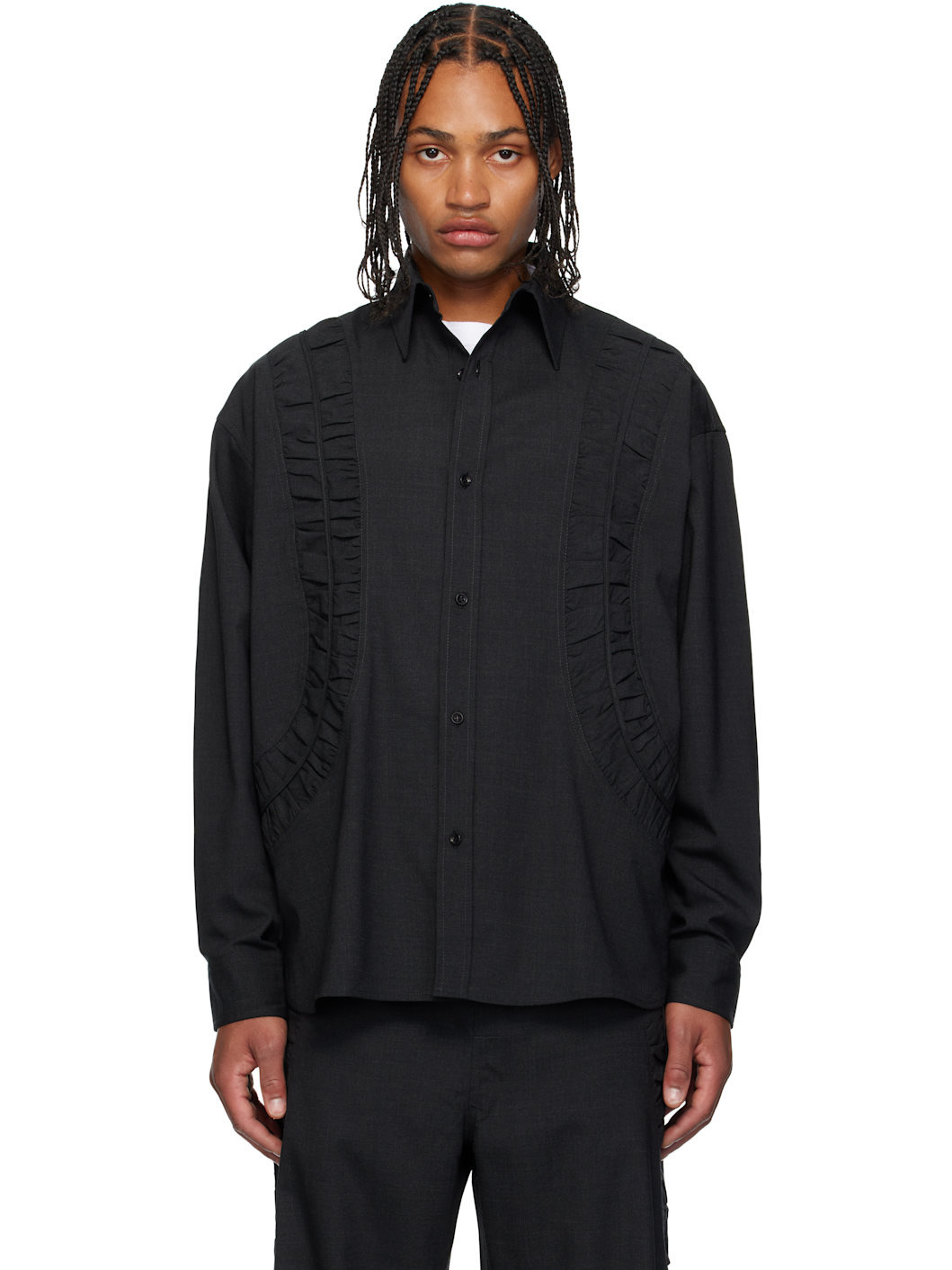 Plain-woven stretch wool-blend shirt. · Gathering throughout · Spread collar · Button closure · Shirttail hem · Pleats at buttoned barrel cuffs · Dropped shoulders · Box pleat at back yoke Supplier color: Charcoal 54% polyester, 44% wool, 2% polyurethane. Made in United Kingdom 252654M192003