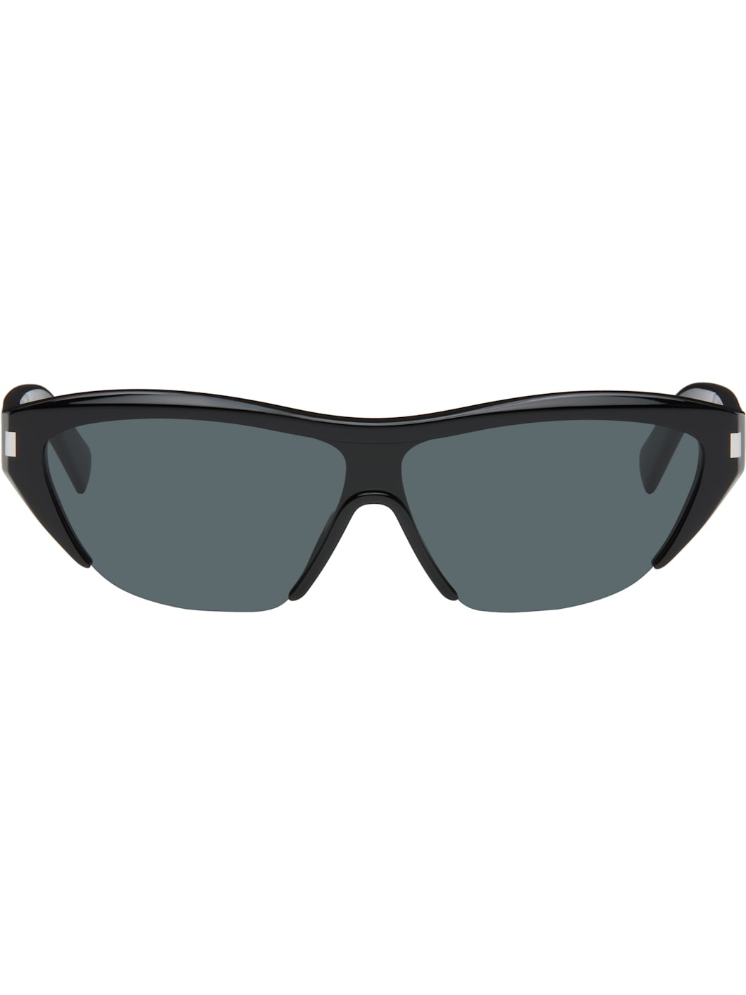 Cat-eye semi-rimless acetate-frame sunglasses in black. · Gray lens, category 3 · 100% UVA/UVB protection · Integrated nose pads · Logo etched at temples · Includes case · Size: 99.1 145 Supplier color: Black Acetate. Made in Italy 252418M134029