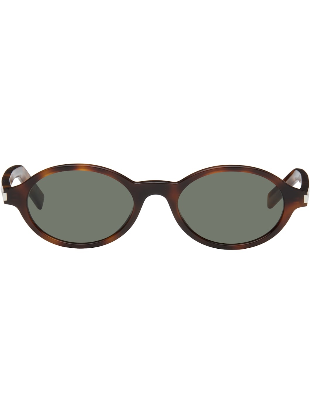Oval tortoiseshell acetate-frame sunglasses in brown. · Gray lenses, category 3 · 100% UVA/UVB protection · Integrated nose pads · Logo etched at temples · Includes case · Size: 50.19 140 Supplier color: Havana Acetate. Made in Italy 252418F005087