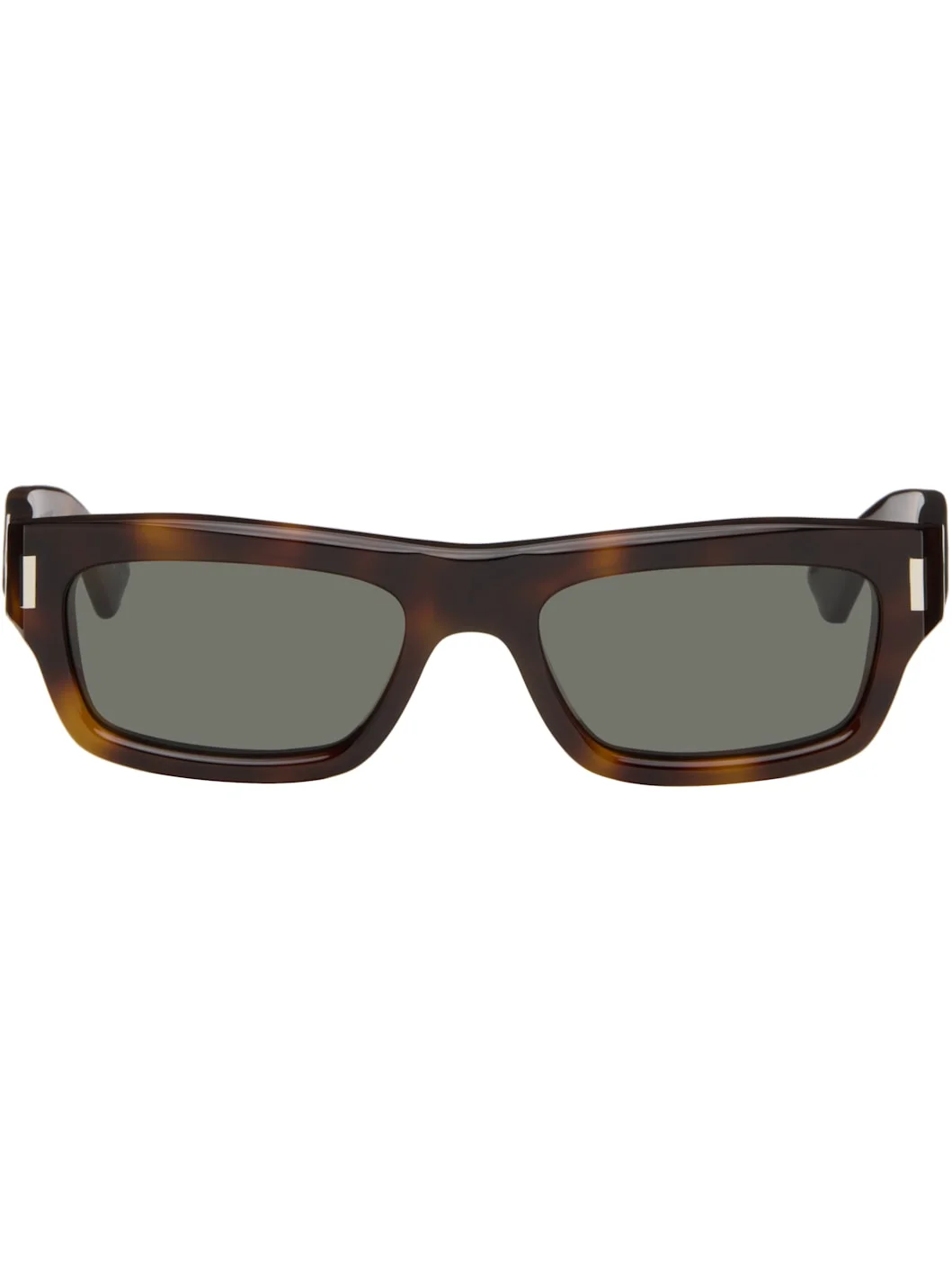 Rectangular semi-transparent tortoiseshell acetate-frame sunglasses. · 100% UVA/UVB protection · Gray lenses, category 3 · Integrated nose pads · Hardware and etched logo at temples · Core wires · Includes case · Size: 54.19 145 Supplier color: Medium Havana/Grey Acetate. Made in Italy 261418M134008