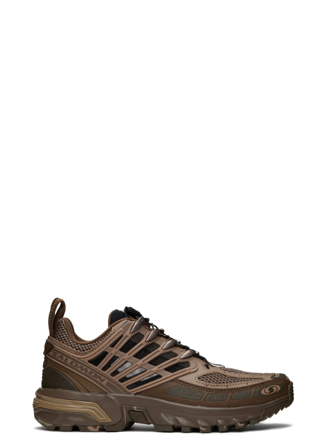 Low-top mesh and buffed faux-leather sneakers in brown. · Rubberized trim throughout · Logo printed at toe and outer side · Quicklace™ closure · Logo patch at padded tongue · Padded collar · Logo-bonded pull loops at heel · Molded OrthoLite® insole · Jersey lining · Agile Chassis™ System at foam rubber midsole · Treaded Contagrip® rubber sole · Logo-engraved bronze-tone hardware Supplier color: Dark earth/Caribou/Wren Upper: textile, synthetic. Sole: rubber. Made in Viet Nam 242837M237008