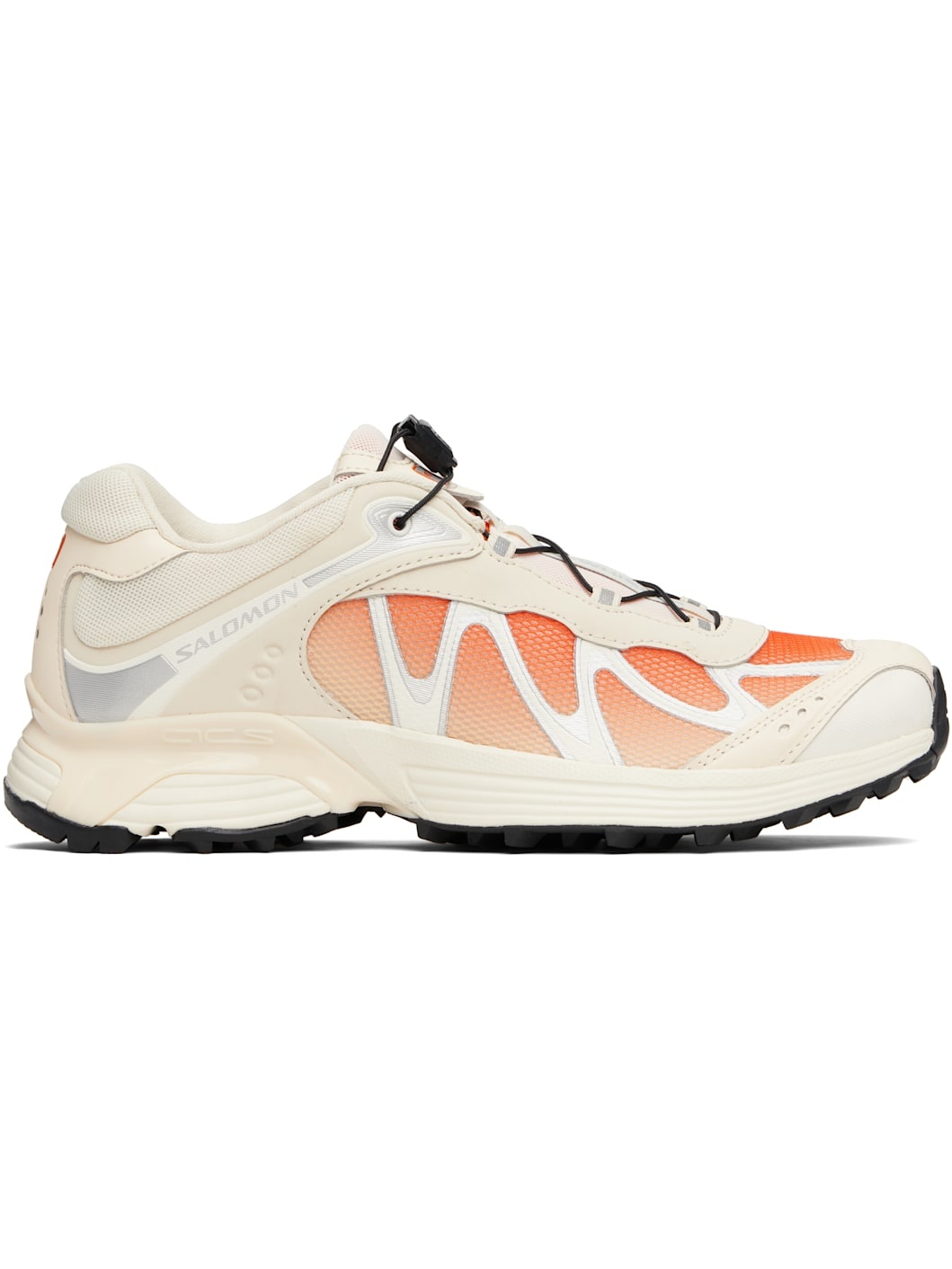 Low-top mesh and faux-nubuck sneakers in off-white and orange. · Reflective trim and gradient throughout · Logo embossed at toe · Quicklace™ closure · Logo patch at padded tongue · Padded collar · sensiFIT™ panel at sides · Logo printed at outer side and heel tab · Molded OrthoLite® insole · Mesh lining · Agile Chassis™ System at EnergyCell midsole · Treaded Mud Contagrip® rubber sole Supplier color: Shortbread/Red orange/Ftw silver Upper: textile, synthetic. Sole: rubber. Made in Viet Nam 252837F128001