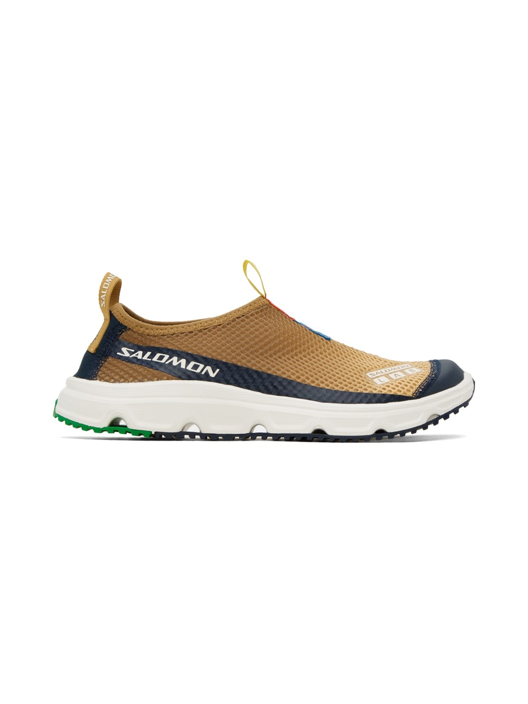 Lightweight low-top mesh sneakers in tan and black. Breathable. · Round rubber cap toe · Logo bonded at vamp · Pull-loops at collar · Reflective logo bonded at outer side · Molded EVA and leather sockliner · EVA foam rubber midsole · Treaded All Terrain Contagrip® outsole Supplier color: Rubber/Taffy/Granada