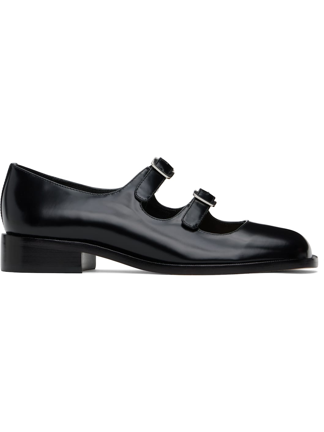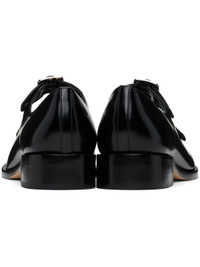 Spazzolato leather ballerina flats in black. · Square toe · Pin-buckle straps at vamp · Logo patch at padded leather footbed · Grained leather and suede lining · Stacked leather heel with rubber injection · Nubuck sole · Heel: H1" Supplier color: Black spazzolato Upper: leather. Sole: leather, rubber. Made in Brazil 251677F118001