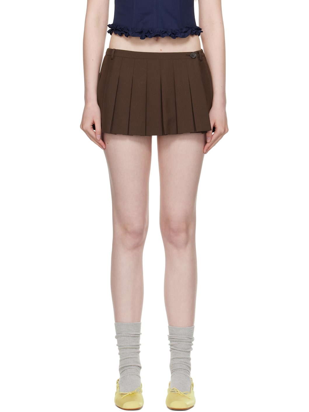 Pleated polyester broadcloth skort. · Low-rise · Belt loops · Zip fly · Vented side seam with button fastening · Viscose satin lining Supplier color: Dark brown Body: 100% polyester. Lining: 100% viscose. Made in United States 252677F088011