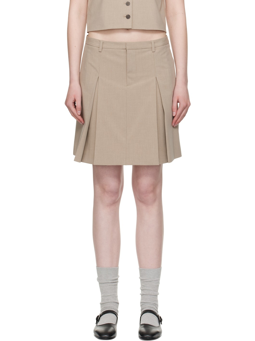 Plain-woven stretch polyester- and rayon-blend miniskirt. · Belt loops · Two-pocket styling · Zip fly · Inverted box pleats at front · Full logo-woven satin twill lining Supplier color: Taupe Body: 57% polyester, 29% rayon, 10% wool, 4% spandex. Lining: 100% viscose. Made in United States 252677F090005