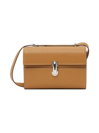 Buffed calfskin shoulder bag in tan. · Convertible crossbody strap · Turn-lock flap · Patch pockets at two-compartment interior · Contrast stitching in off-white · H5.5" x W7.75" x D3.25" Supplier color: Saddle Calfskin. Made in Italy 242163F048016