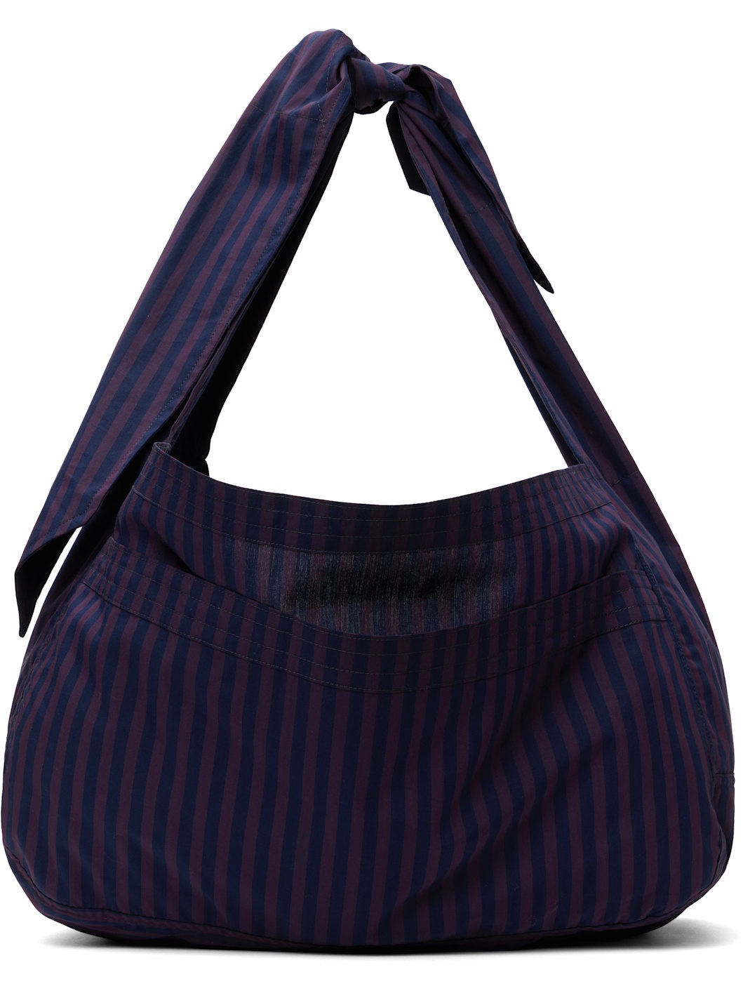 Cotton twill tote in purple and navy. · Stripes throughout · Fixed crossbody strap · Patch compartment at face · Open throat · Unlined · H10" x W17" x D7.5" Supplier color: Arcade 100% cotton. Made in United States 252490M170003