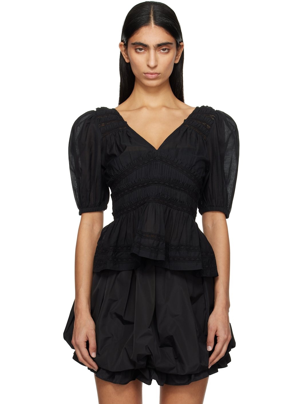 Cotton- and viscose-blend poplin blouse. Lace and ruffled trim throughout. · Plunging V-neck · Puff sleeves · Elasticized cuffs · Zip closure at low back Supplier color: Black 55% cotton, 45% viscose. Made in India 251271F107000