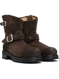 Ankle-high suede boots. · Studs and strap at vamp · Notch at collar · Pin-buckle straps at outer side · Contrast stitching in beige at welt · Stacked leather and rubber midsole · Rubber sole Supplier color: Brown suede Upper: leather. Sole: leather, rubber. Made in Italy 252902M228001