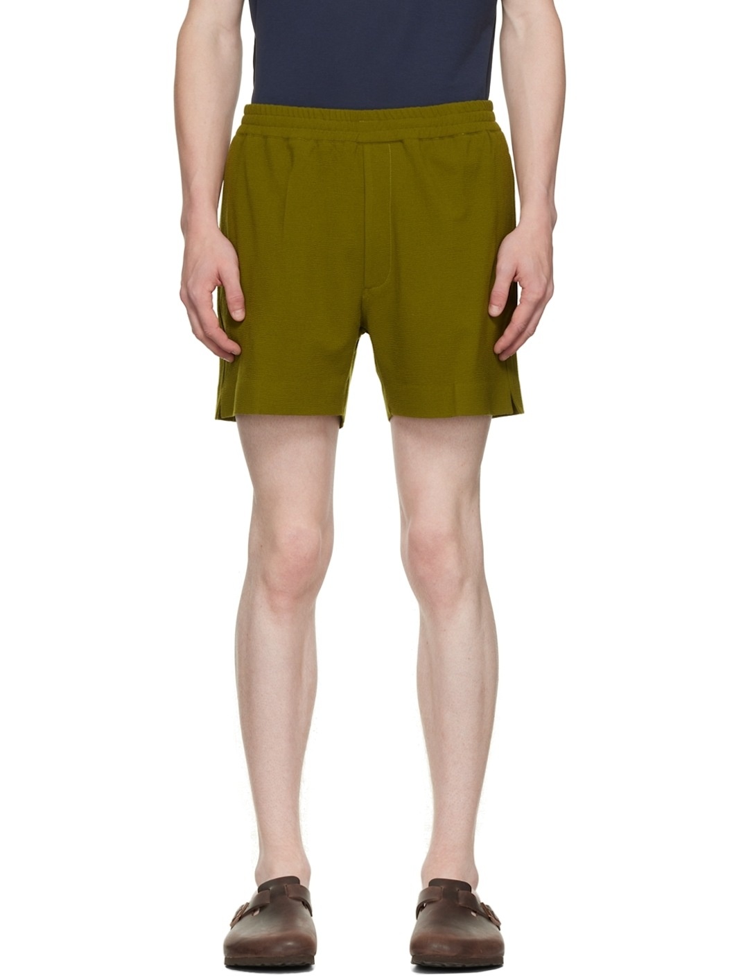 Stretch virgin wool and nylon-blend crepe shorts. · Drawstring at elasticized waistband · Three-pocket styling · Zip-fly · Pleats at front Supplier color: Moss Body 1: 88% virgin wool, 10% polyamide, 2% elastane. Body 2: 65% acrylic, 35% polyester. Made in Italy 221902M193001