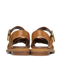 Buffed calfskin flat sandals in tan. · Open toe · Crisscrossing straps at vamp · Pin-buckle ankle strap · Logo-embossed padded grained leather footbed · Buffed leather lining · Topstitching at welt · Stacked leather midsole · Rubber sole · Logo-engraved gold-tone hardware Supplier color: Tan Upper: calfskin. Sole: rubber. Made in Spain 241373F124005