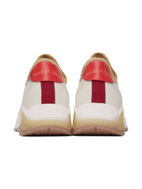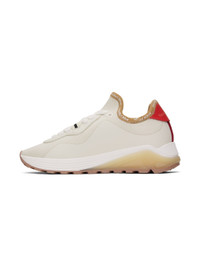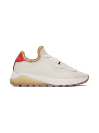Low-top paneled knit, bonded rubber, and buffed leather sneakers in white, tan, orange, and red. · Striped grosgrain flags at lace-up closure · Logo printed at collar · Logo embossed at heel tab · Suede lining · Textured rubber midsole · Treaded rubber sole Supplier color: White Upper: textile, rubber, leather. Sole: rubber. Made in Indonesia 241373F128005