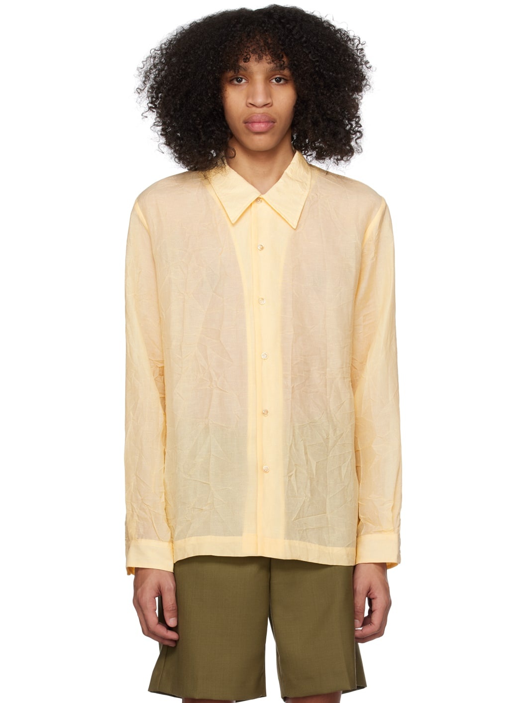 Lightweight crinkled viscose- and linen-blend gauze shirt. · Spread collar · Button closure · Adjustable single-button barrel cuffs · Mother-of-pearl hardware Supplier color: Voluminous beige 81% viscose, 19% linen. Made in Latvia 231491M192033