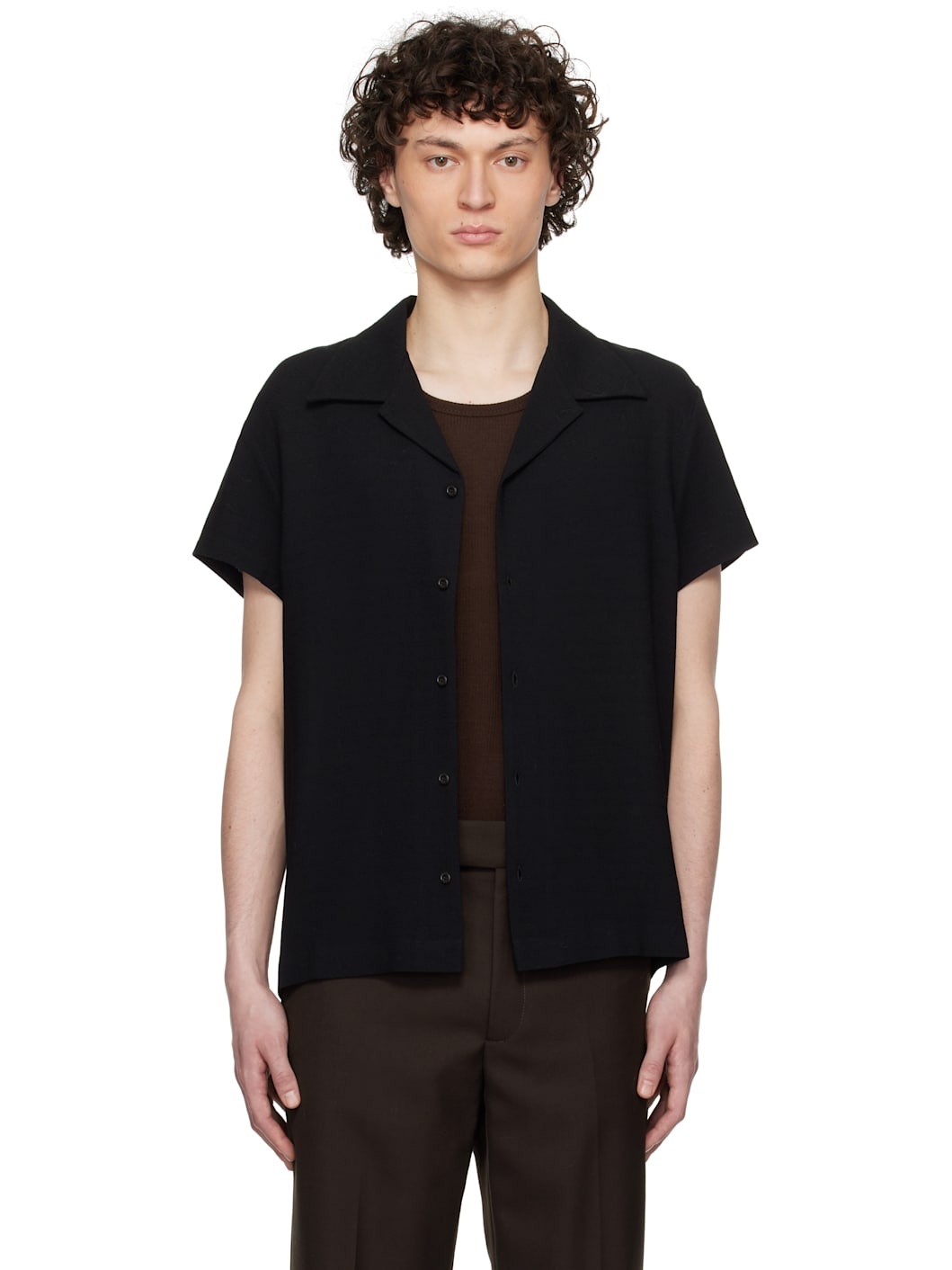 Viscose- and virgin wool-blend crepe shirt. · Open spread collar · Button closure · Mother-of-pearl hardware Supplier color: Black crepe 60% viscose, 40% virgin wool. Made in Latvia 251491M192018