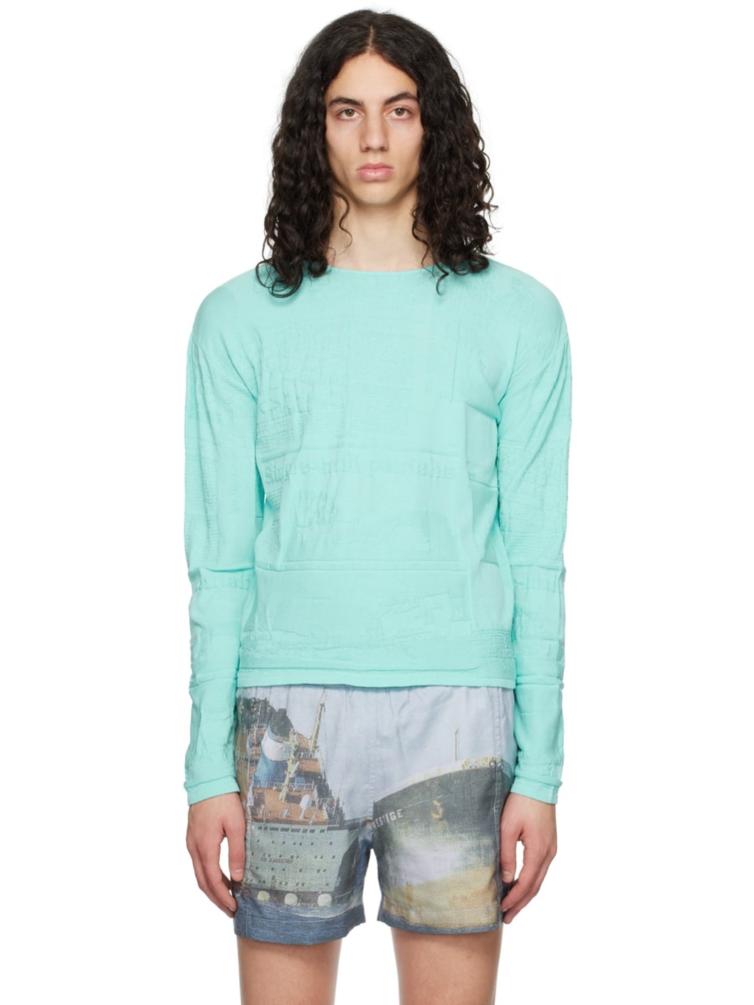 Viscose- and recycled polyester-blend cloque T-shirt. · Logo and graphic pattern throughout · Rib knit crewneck, hem, and cuffs Supplier color: Newspaper ciel 70% viscose, 30% recycled polyester. Made in Greece 231238M201004