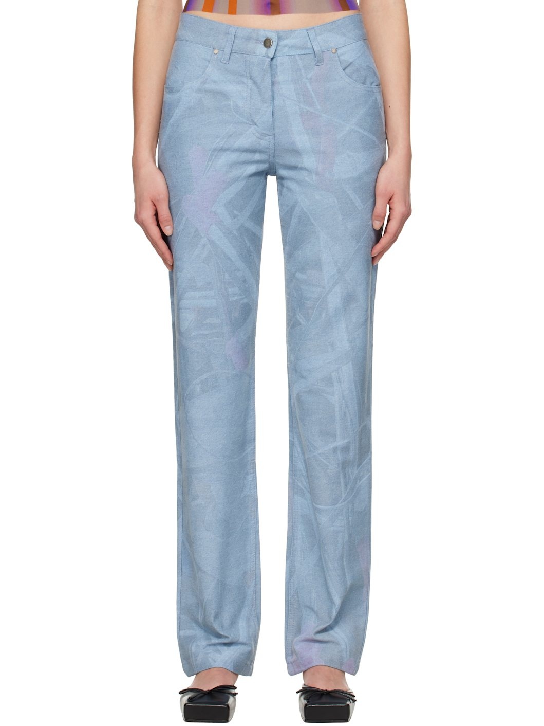 Non-stretch denim jeans. Graphic pattern and fading throughout. · Belt loops · Four-pocket styling · Button-fly · Leather logo patch at back waistband · Logo flag at back pocket · Logo-engraved antiqued silver-tone hardware Supplier color: Print 100% cotton. Made in Greece 251238F069000