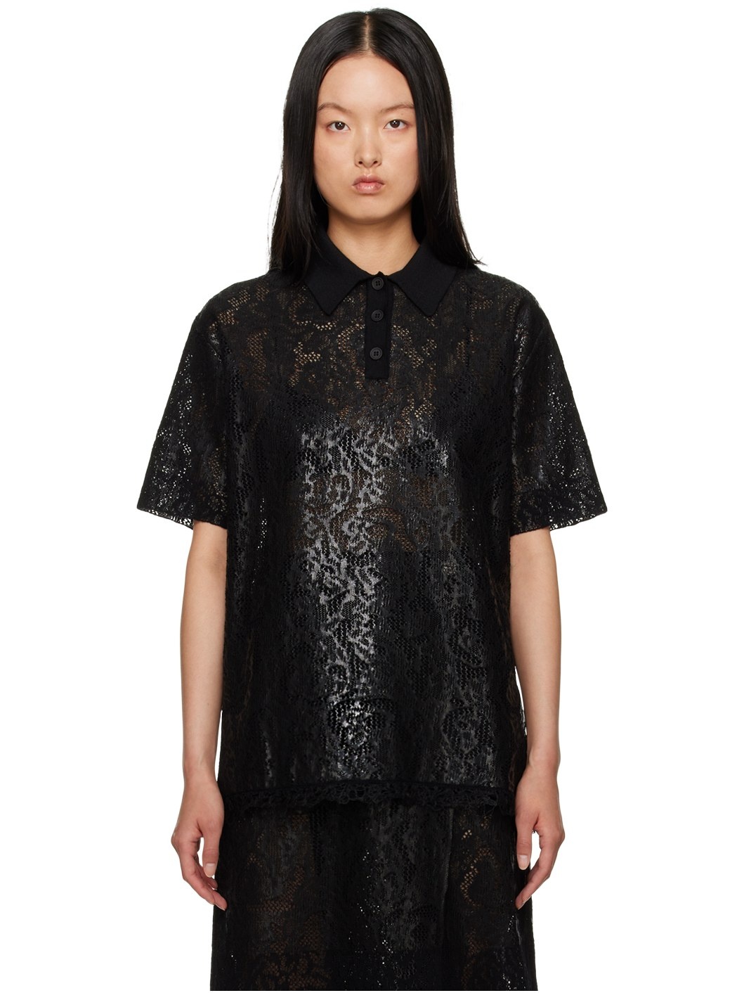 Polyurethane-coated virgin wool-blend lace polo. · Rib knit spread collar · Three-button placket · Scalloped edge at hem · Vented side seams Available exclusively at SSENSE. Supplier color: Black 65% virgin wool, 25% polyurethane, 7% polyester, 3% polyamide. Made in Italy 231091F108000