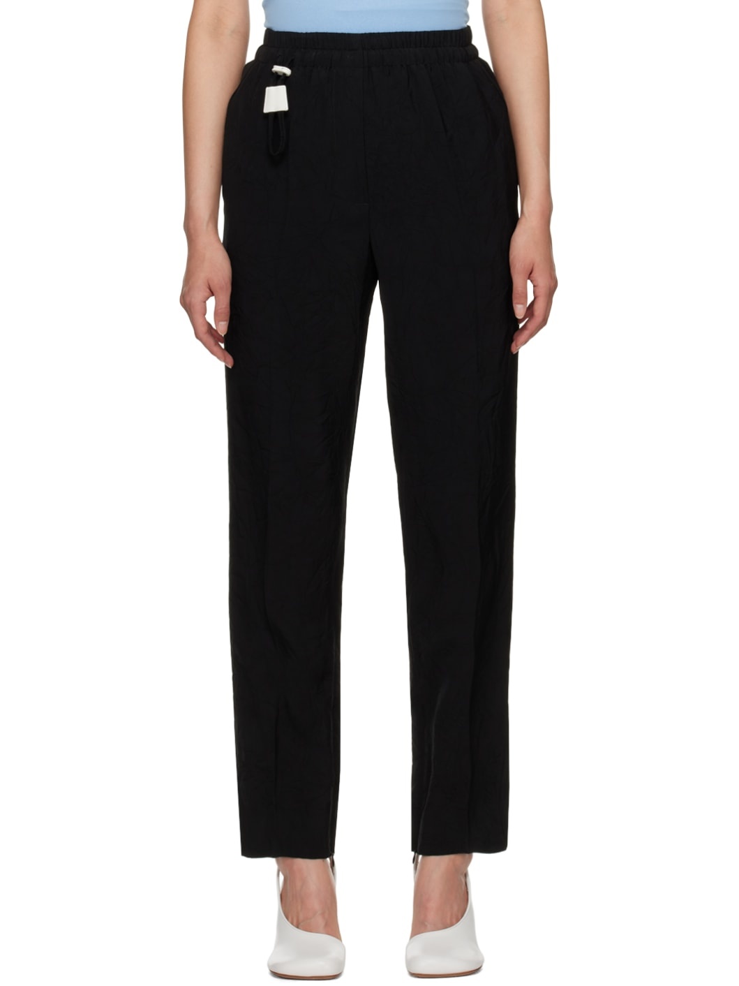Crinkled viscose canvas trousers. · Bungee-style drawstring at elasticized waistband · Three-pocket styling · Creases at front · Zip vent at cuffs Available exclusively at SSENSE. Supplier color: Black 100% viscose. Made in Italy 231091F087001