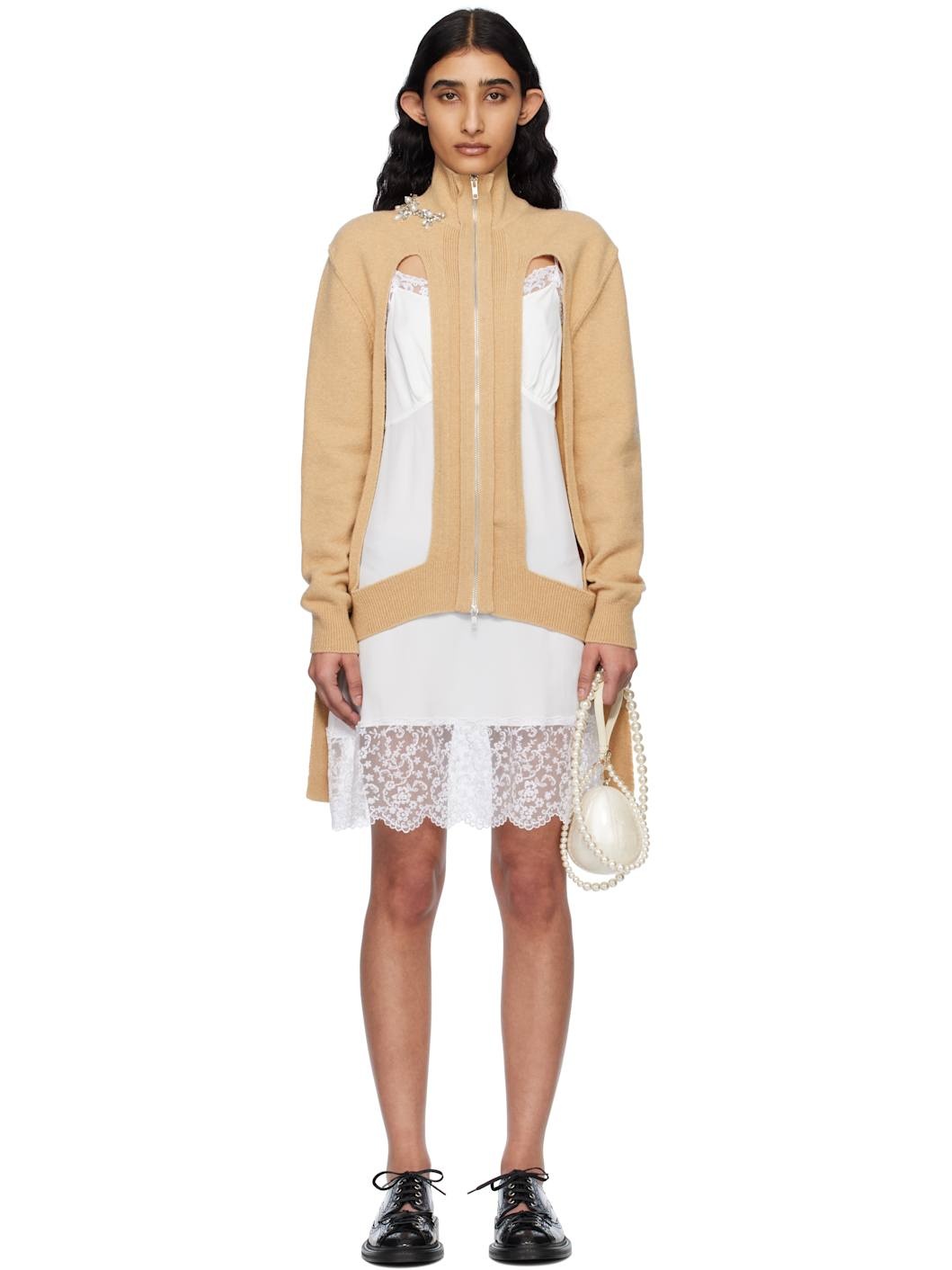 Knit stretch virgin wool-blend cardigan. · Rib-knit stand collar, hem, and cuffs · Crystal-cut floral applique at collar · Two-way zip closure · Cutouts at front · Extended rib-knit trim at side seams Supplier color: Camel/Pearl 93% virgin wool, 6% nylon, 1% elastane. Made in Portugal 251405F095001
