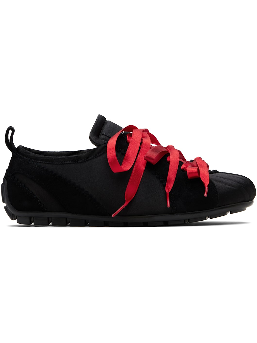 Low-top satin and suede sneakers. · Serrated edges throughout · Pleats at toe · Satin lace-up closure · Logo patch at padded tongue · Grosgrain trim at padded collar · Pull-loop at heel collar · Leather lining · Treaded rubber sole Supplier color: Black/Red Upper: textile, leather. Sole: rubber. Made in Portugal 252405F128007