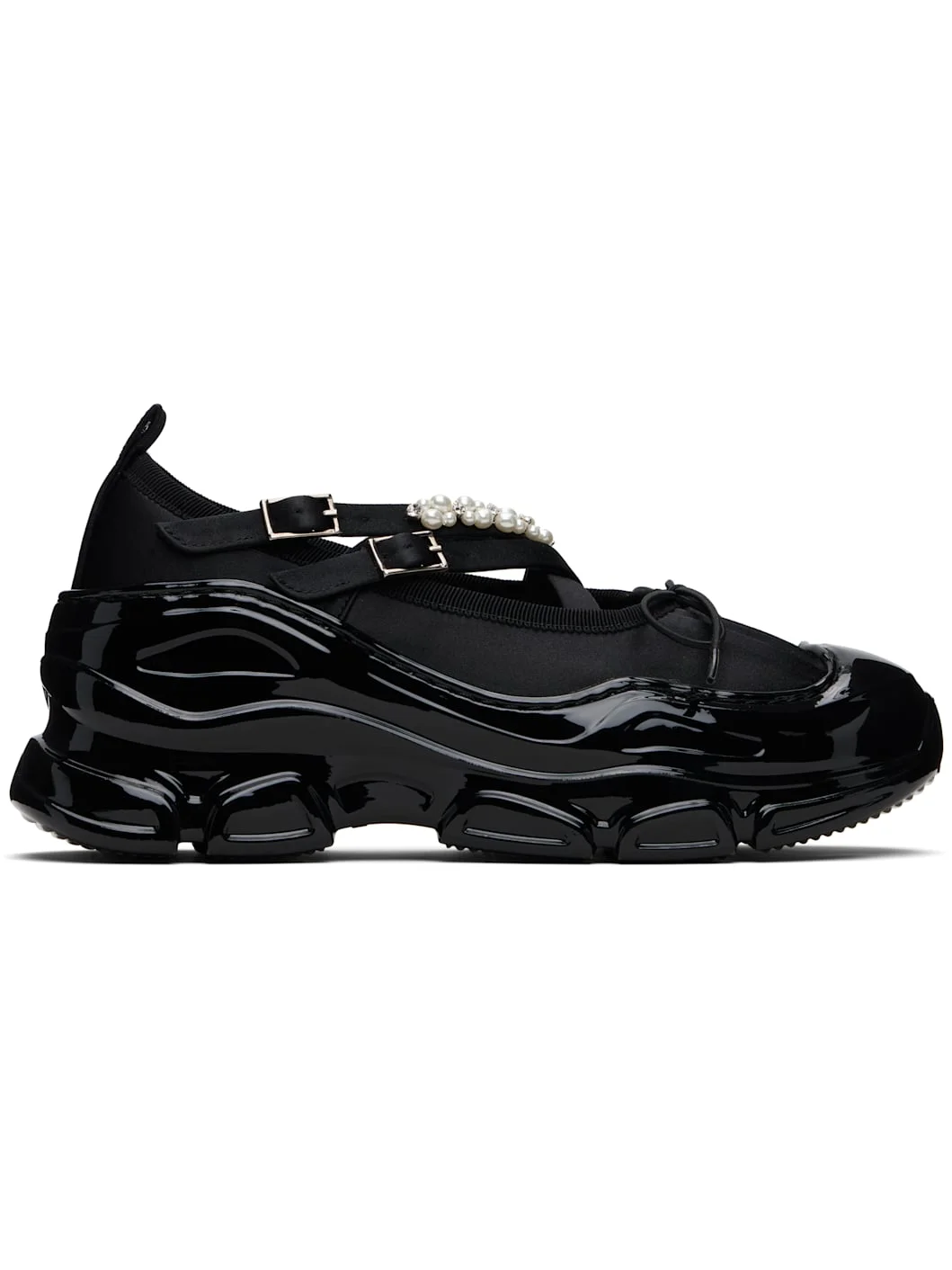 Satin ballerina flats. · Vinyl trim throughout · Pleats and bow at toe · Faux-pearls at criss-crossing elasticized straps · Pin-buckle fastenings · Pull-loop at heel collar · Buffed leather lining · Treaded rubber sole Supplier color: Black/Clear/Pearl Upper: textile. Sole: rubber. Made in Portugal 252405F128004