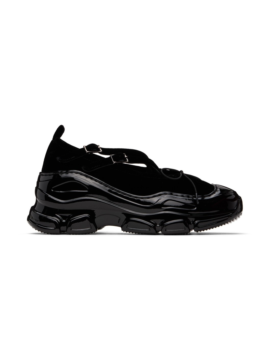 Velvet sneakers in black. · Pleats and bow accent at vamp · Criss-crossing pin-buckle straps · Pull-loop at heel collar · Logo embossed at padded leather footbed · Suede and buffed leather lining · Rubberized trim at welt and sculptural midsole · Treaded EVA rubber sole Supplier color: Black Upper: textile. Sole: rubber. Made in Portugal 242405F118006