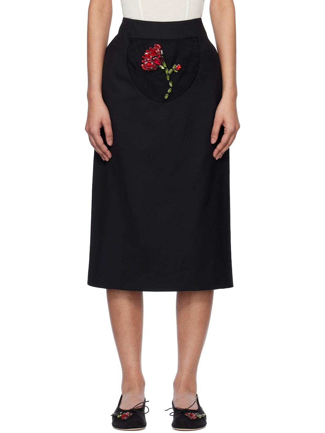 Virgin wool twill midi skirt. · Nylon tulle panel at front · Crystal-cut floral applique · Seam pockets · Darts at back waistband · Concealed zip closure at back · Central vent at back hem · Fully lined Supplier color: Black/Red multi Body 1: 100% virgin wool. Body 2: 100% polyamide. Lining: 60% acetate, 40% cupro. Made in Portugal 251405F092001