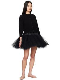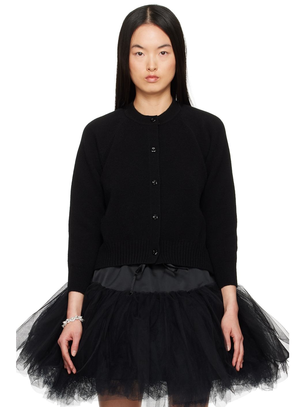 Knit stretch virgin wool-blend cardigan. · Rib-knit crewneck, hem, and cuffs · Button closure · Draping at hem · Raglan sleeves · Open back Supplier color: Black 93% virgin wool, 6% polyamide, 1% elastane. Made in Portugal 251405F095002