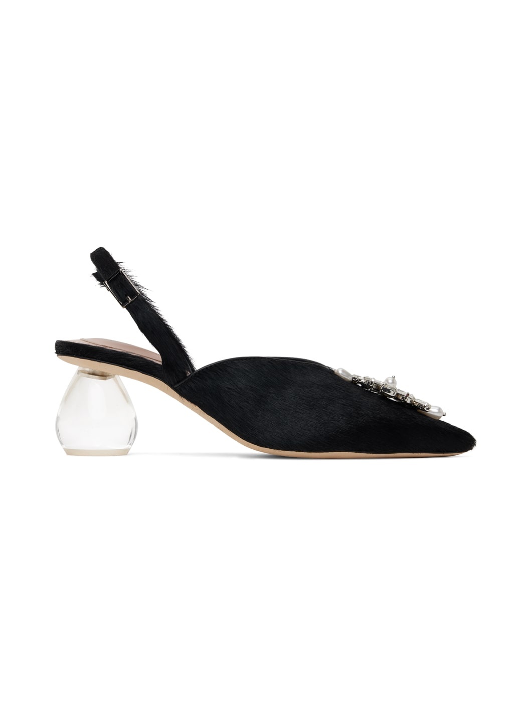 Calf-hair heels in black. · Pointed toe · Faux-pearl and crystal-cut accents at vamp · Pin-buckle slingback strap · Logo embossed at padded footbed · Grained calfskin lining · Perspex® sculptural heel with rubber injection · Nubuck sole · Heel: H2.5" Supplier color: Black/Pearl/Clear Upper: calfskin. Sole: leather, rubber. Made in Portugal 242405F122004