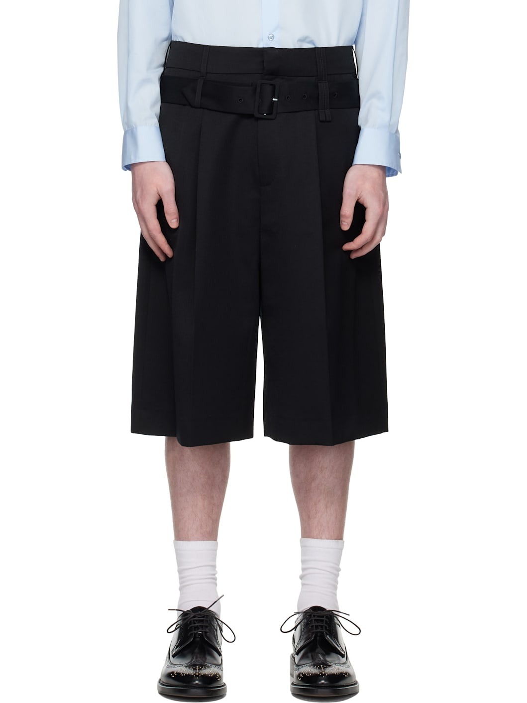 Virgin wool-blend venetian shorts. · Wide-leg · High-rise · Belt loops and detachable pin-buckle belt · Four-pocket styling · Zip fly · Pleats at front · Creased legs Supplier color: Black Body: 55% polyester, 45% virgin wool. Trim: 60% acetate, 40% cupro. Made in Portugal 252405M193004