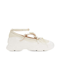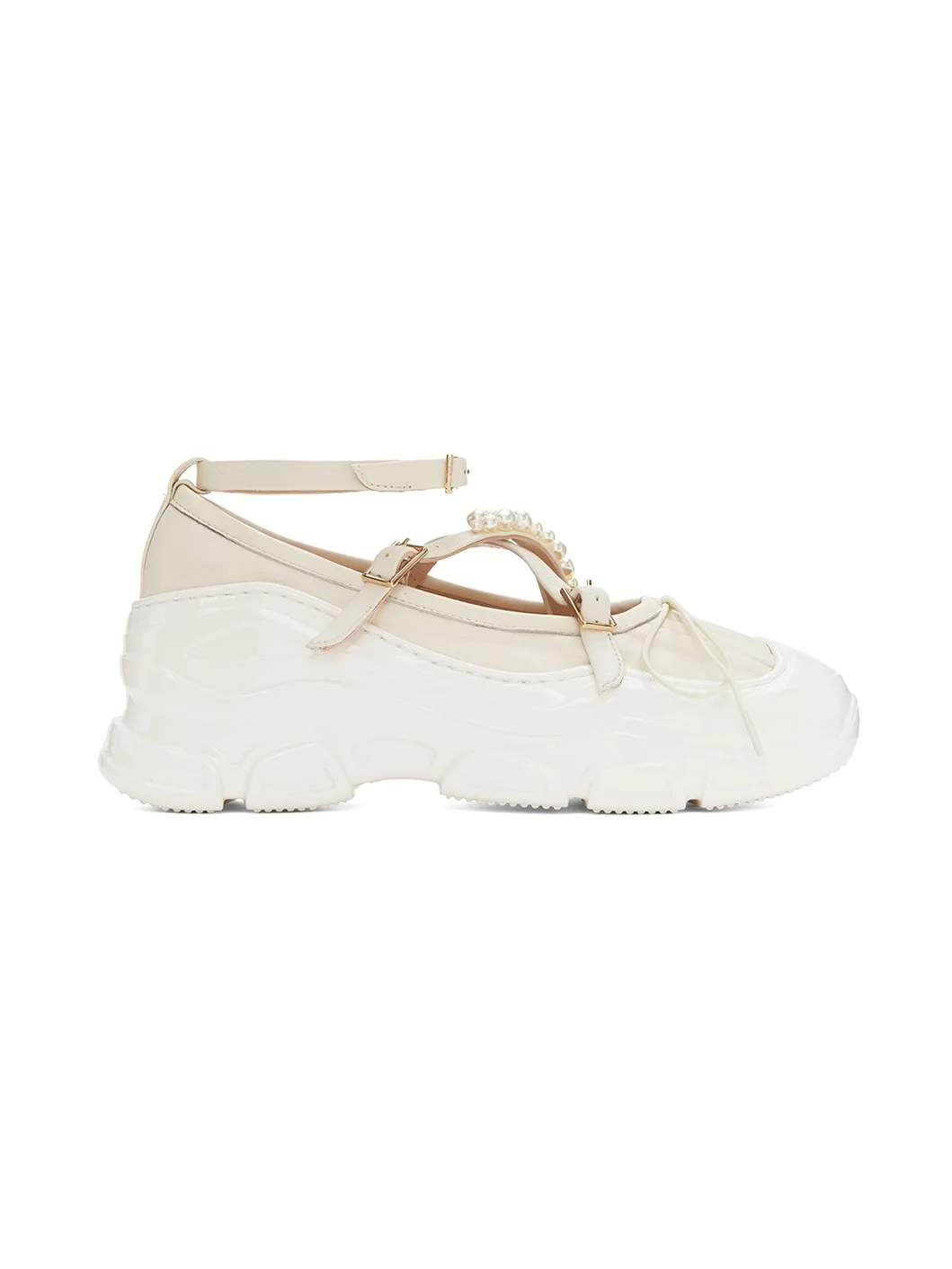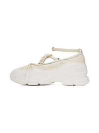 Grained nappa lambskin ballerina flats in off-white. Faux-pearl accents at vamp. · Pleats and bow accent at toe · Criss-crossing pin-buckle straps at vamp · Detachable pin-buckle ankle strap · Pull-loop at heel collar · Logo embossed at padded footbed · Textured rubber platform midsole · Treaded EVA rubber outsole · Platform: H1.5 in Supplier color: Ivory/Ivory/Pearl/Clear